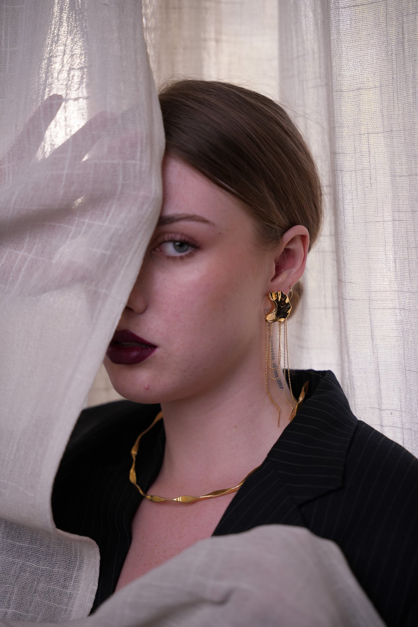 The fluid design rests comfortably on the collarbone, offering a polished, modern take on timeless gold jewelry. Whether worn solo or layered, this necklace adds a sophisticated gleam to any look.
